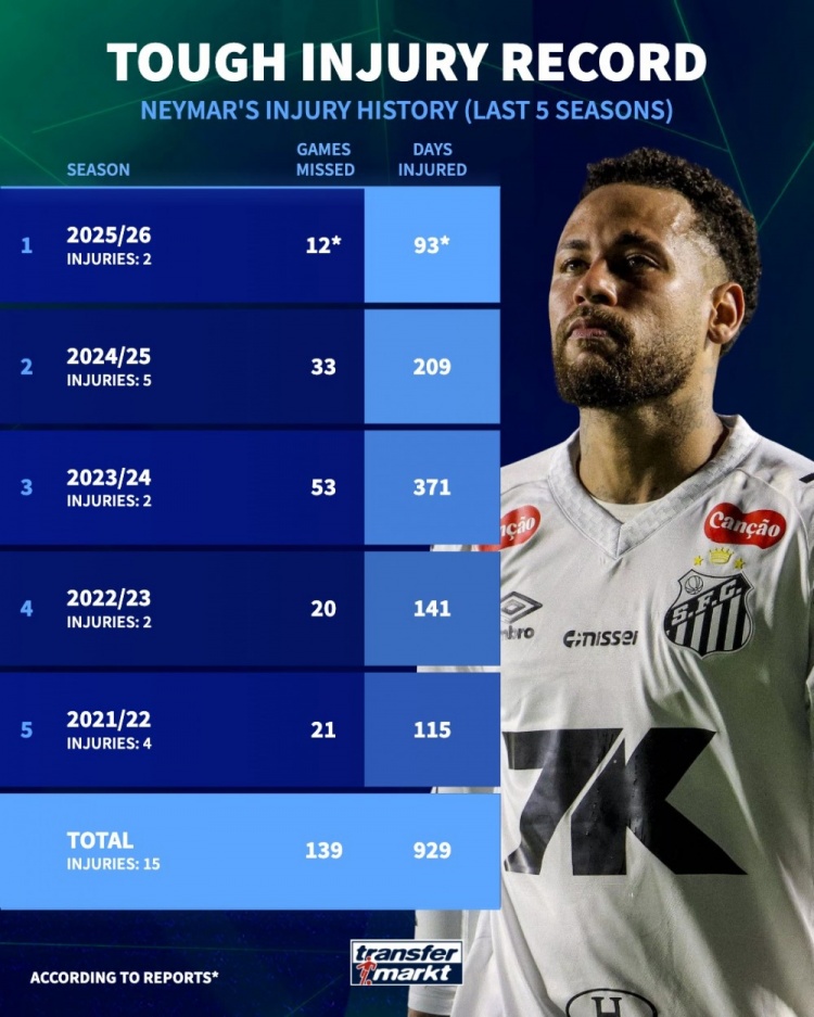 11月26日讯 德国转会市场统计了内马尔近5个赛季的伤病情况,他总计受伤15次,伤缺929天。
